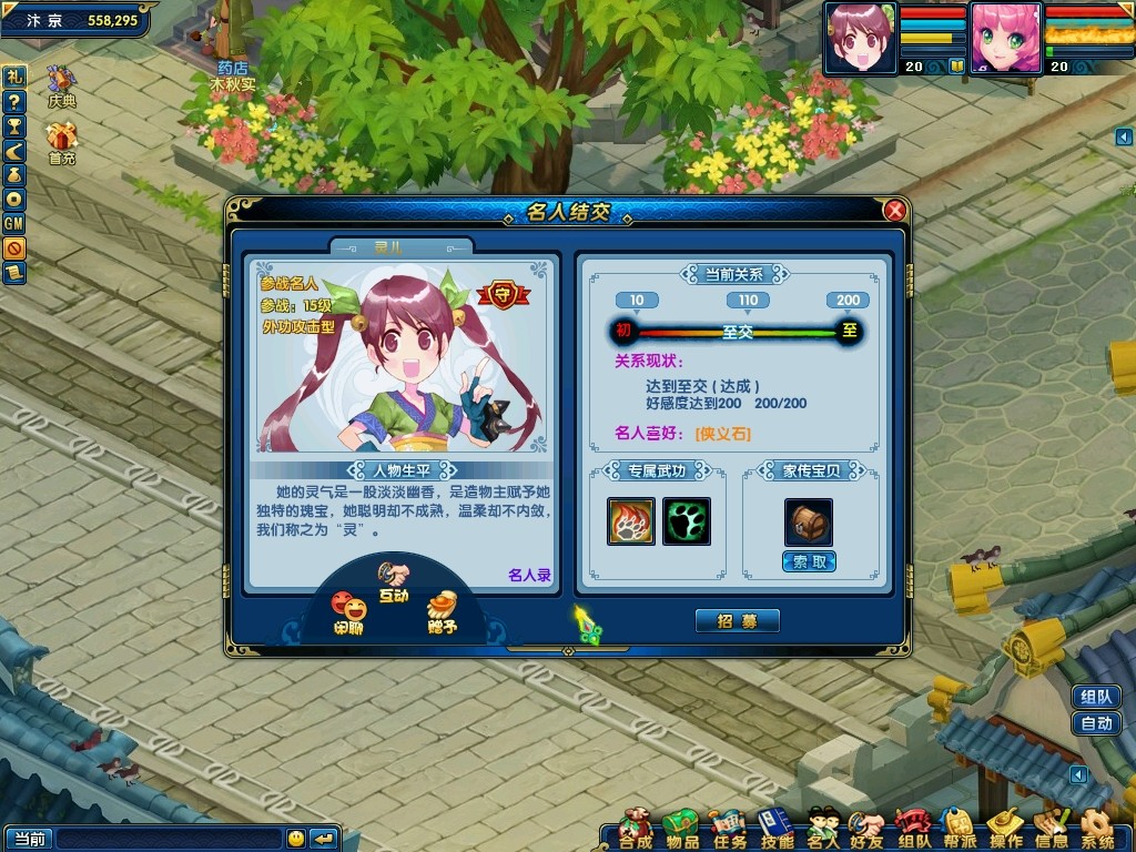完成新手任务后,玩家可以开始进行结交名人,使用Alt+R组合键可以打开名人录界面,每个玩家都可以去与携带等级小于等于角色等级+5级的名人交互,从而提升好感度,当玩家与名人的好感度达到一定的程度时,玩家将可以携带该名人出战。