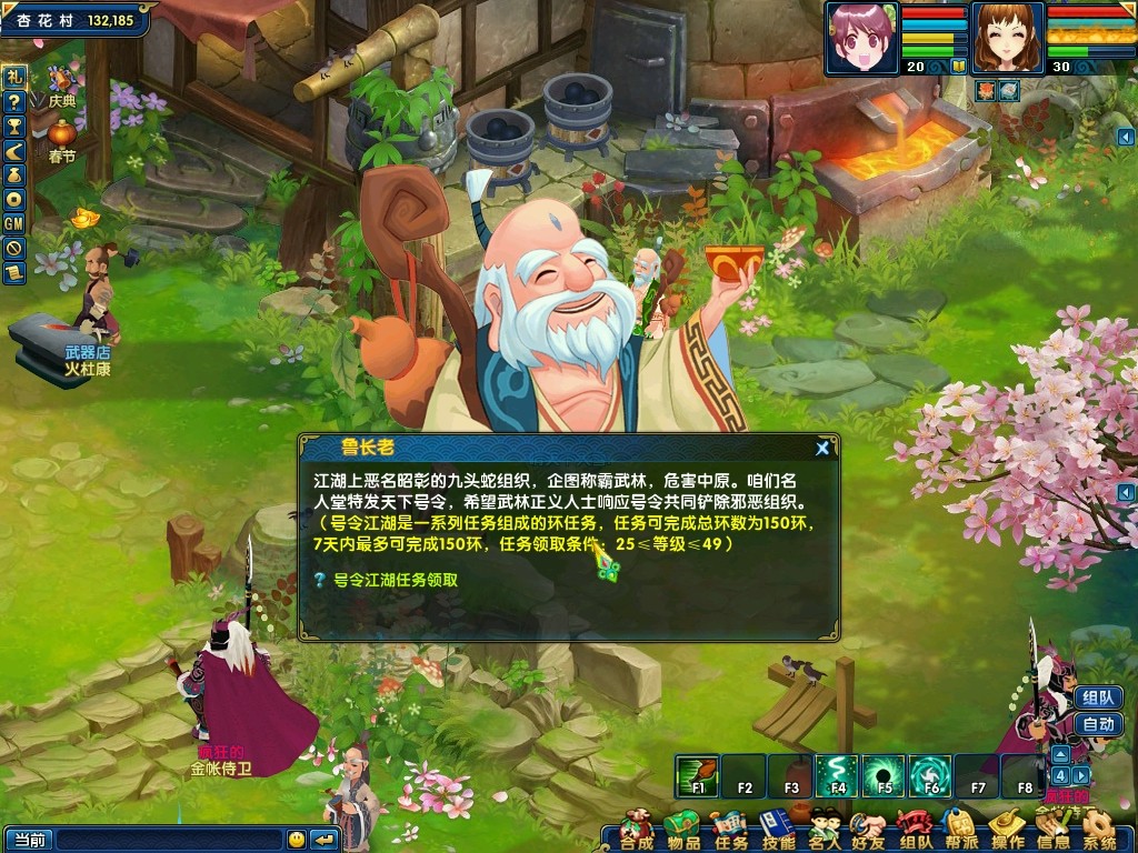 等级达到25级且小于50级时,可以到汴京找鲁长老领取号令江湖任务,该任务每周可以进行150环,完成每环都可以获得大量的经验值奖励,并且每完成10环任务还可以获得一定的洗髓丹奖励。