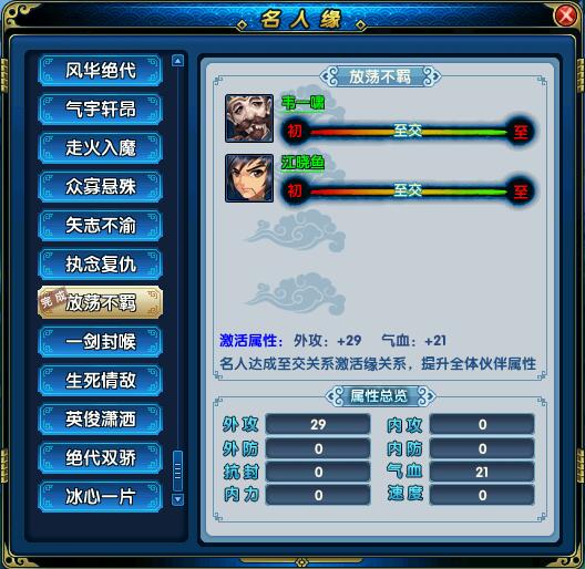 有缘关系的名人,玩家把他们的技能熟练度修炼满就激活缘关系啦,并且为玩家的所有#R名人伙伴#n增加相应的属性,不同缘激活后的属性是可以叠加。