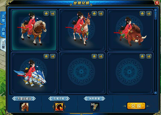 1、玩家可以找汴京(552,234)史金刚兑换坐骑,目前可以兑换的坐骑是千里乌骓马、九天雪花鹿、野鬃疾行猪、星门巨牙象和霹雳奔雷虎。