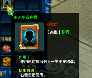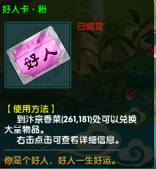 平日看腻了的称谓是不是感觉到枯燥无味了呢?别担心~!只要你帮助其他小伙伴后得到足够数量的好人卡就去找汴京(268,178)香菜兑换永久称谓“好人一生平安”还可以兑换宝石、提升与名人修炼度的道具、增加宠物资质的内丹等多种实用的道具呢,在默默变成雷锋的同时又可以收获不菲的奖赏,一举两得,何乐而不为呢!?