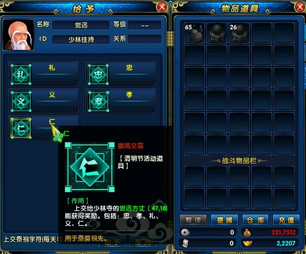 清明节将至,传统的祭祖扫墓不可或缺,可作为江湖后起之秀的你们是否会将“忠孝礼义仁”这立身之本来告慰先祖呢?在3月30日~4月19日期间,玩家在进行副本、镇魔和击败云游大盗时获得的“忠、孝、礼、义、仁”5种字符后交由少林寺觉远来祭拜先祖,成功上交后获得丰厚的经验、银票和通宝奖励哦~!