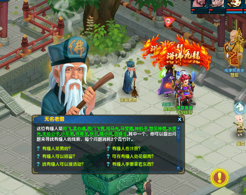 因少林寺长年没人打扫,寺内到处布满了灰尘,少林住持觉远故派无名老僧前去打扫,可只有老僧孤身一人,根本扫不动这偌大的寺庙,需要打扫神器“至尊扫帚”的帮助,但年老的无名僧一时想不起来这件神器在谁的手上,依稀记得几条线索,你会来帮助他找到有缘人吗?在4月27日至5月3日期间,玩家可到少林寺(79,22)找无名老僧接取任务,并且可以向老僧给出的8个问题来提问获取线索,每次提问消耗2个青竹叶,而青竹叶可每天在npc处领取青竹叶,也可以在镇魔、缉凶等日常任务中获得。如果猜对的话即可获得相应的至尊扫帚,猜错则避免不了一场战斗哟~完成任务后可凭相应的扫帚来领取奖励,扫帚分为铜、白银、黄金等,最高级别是至尊黄金扫帚,此扫帚换取的奖励是最高的~出色完成任务的小伙伴们可获得经验、银票、通宝奖励哦!