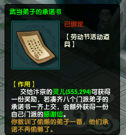 劳动节之际,各大门派中有部分弟子不思劳动,偷懒旷工。各位大侠请前往各大门派寻找偷懒的弟子进行言传声教。活动时间内,在各大门派会出现偷懒的弟子,玩家组队击败偷懒的弟子即可获得承诺书,上交承诺书可以获得各门派的感谢信,上交感谢信可以获得大量奖励。