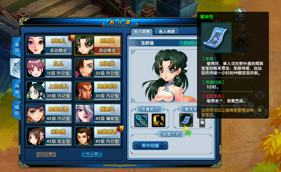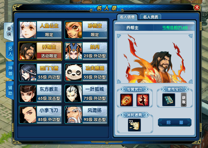 回合游戏除了人物战斗,怎么能少的了宝宝来助阵呢?动漫武侠回合游戏《盖世豪侠》宝宝系统的核心就是名人系统,茫茫江湖中有百名绝顶武林高手等着与各位玩家交锋,更有数位名人可与您携手并肩作战共闯天下。