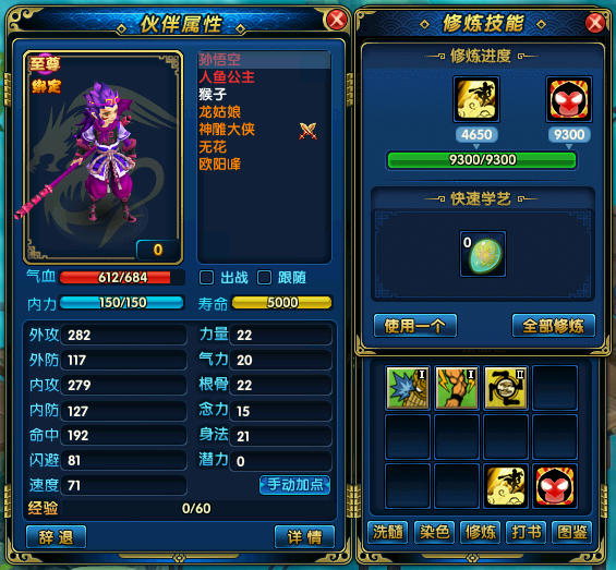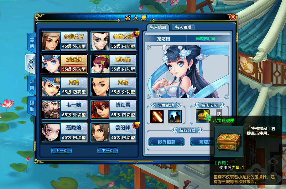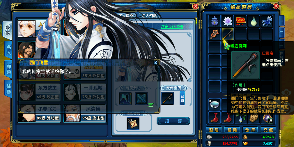 还有很多名人传家宝贝都是增加永久人物属性的道具,提升战力就在此时!例如西门飞雪修炼满后,就可以领取峨眉剑刺,使用后可以永久增加人物3点气力,对于内功职业来说是极大的提升哦,还有各种名人传家宝会加力量、身法等其他属性哦,等着大家来探索。