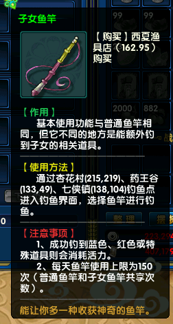 每天在浩荡的江湖世界中的冒险,战火纷飞剑影刀光,也许是时候该换一种节奏了,让时光缓慢推进,让我们可以在此刻细细品味当中的闲适怡情。≥45级的小伙伴可以到西夏灵州(162,95)渔夫大叔购买鱼竿来钓鱼,鱼竿分为普通鱼竿和子女鱼竿,子女鱼竿 同普通鱼竿,但不同的是可以有几率额外钓到子女用品哦,如智牌、童趣碎片(兑换子女装备)等道具哦!~放慢时光的脚步,品味悠闲的乐趣。