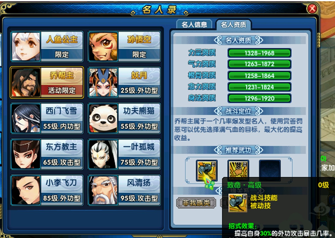 闯荡江湖,自然少不了武功高强的名人携手助阵。《盖世豪侠》将传统网游的召唤兽升级打造成名人系统,一个名人自带两种专属武功,如小李飞刀的飞刀问情(无限追击)、朱姑娘的易容(复制主人部分属性)等等,可谓锦上添花!
