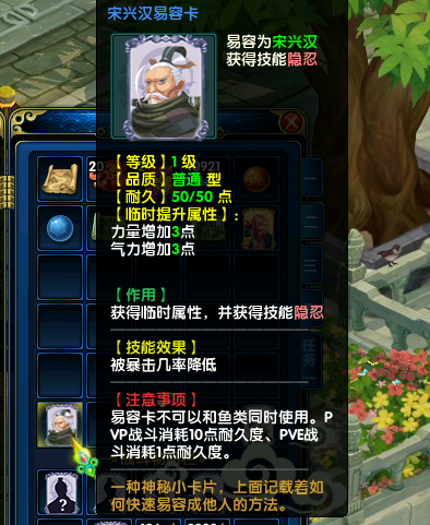 易容卡效果:携带“隐忍”技能。