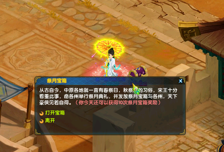 活动介绍:从古自今,中原各地就一直有春祭日,秋祭月的习俗,宋王十分看重此事,命各州举行祭月典礼,并发放祭月宝箱与各州,天下豪侠见着自得。