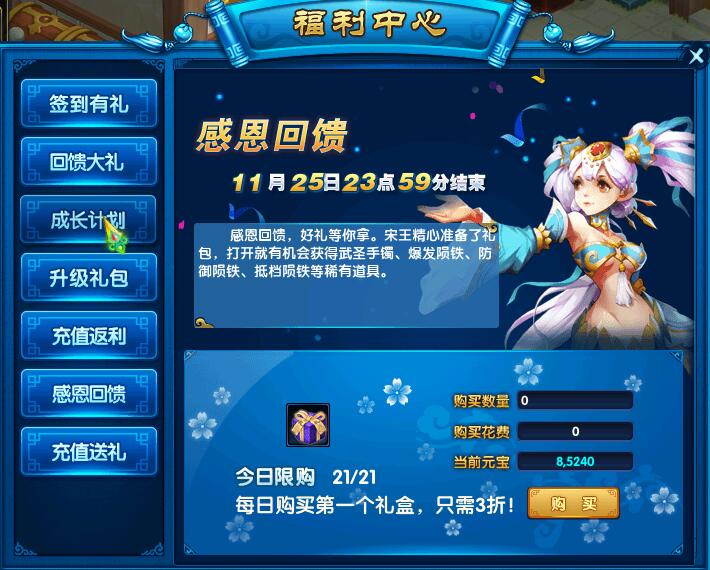 活动介绍:活动期间,在福利中心限时开启感恩回馈活动。购买感恩回馈礼包即可获得武圣手镯、爆发陨铁、防御陨铁、抵档陨铁等稀有道具。每天购买第一个礼包还可享受3折优惠。