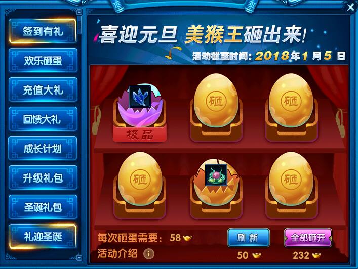元旦砸金蛋活动将在这次版本更新中火热开启。12月31日至1月5日活动期间,将会在福利中心中限时开放砸金蛋活动。砸开金蛋既有机会获得稀有道具奖励,更有机会遇见神秘彩蛋(砸彩蛋有几率砸出豪侠孙悟空哦)。除旧迎新,让我们一起欢乐砸蛋!