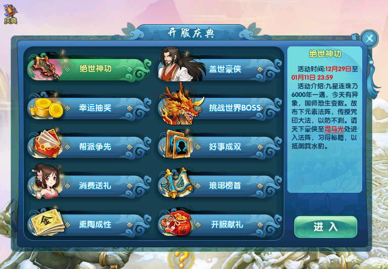 除了欢乐砸蛋活动全面开放外,还有盖世豪侠、挑战世界boss获得绝版神器、开服献礼、英雄排行榜绝版称谓等活动,让你能够站在一个更高的起点!尽管豪侠路漫漫,但这份诚意,将伴随你一路走到最后!