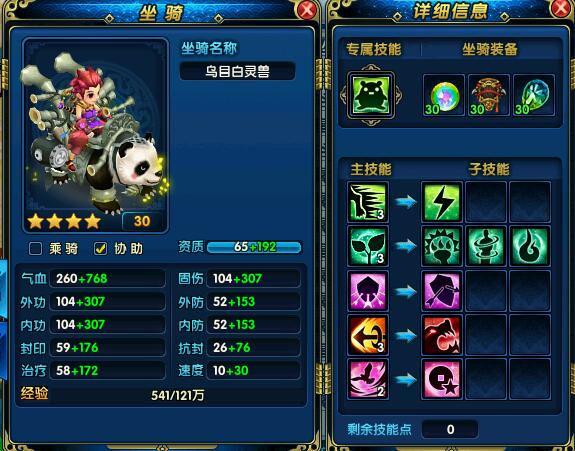 乌目白灵兽,私有坐骑,只有通过巅峰战斗且获得巅峰冠军的队伍才能获得哦。它长得酷似我们现实里可爱的大熊猫,这让我们怎么能忍心伤害它呢,因此,它拥有了一个特殊的专属技能。