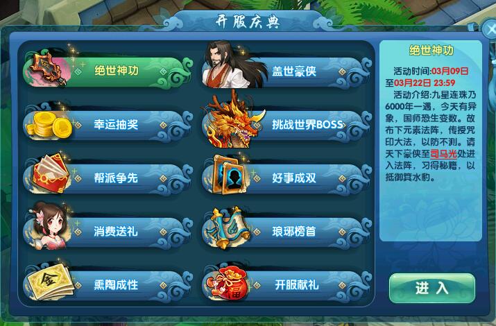 元宵在爆竹声中渡过了,意味着春节也已经结束,我们的工作或者学习也要从新开始了,在新的一年里,我们得订立一个新目标,新方向,并朝着这个目标、方向努力。为了欢送春节,《盖世豪侠》在新版本里也增加了许多新鲜好玩的内容。全新套路、全新五星名人、全新副本,给你带来全新的游戏体验。本次更新除了一系列好玩不腻的活动外,还有九大开服福利活动等着大家去完成。精彩不容错过,快来一起看一看吧!