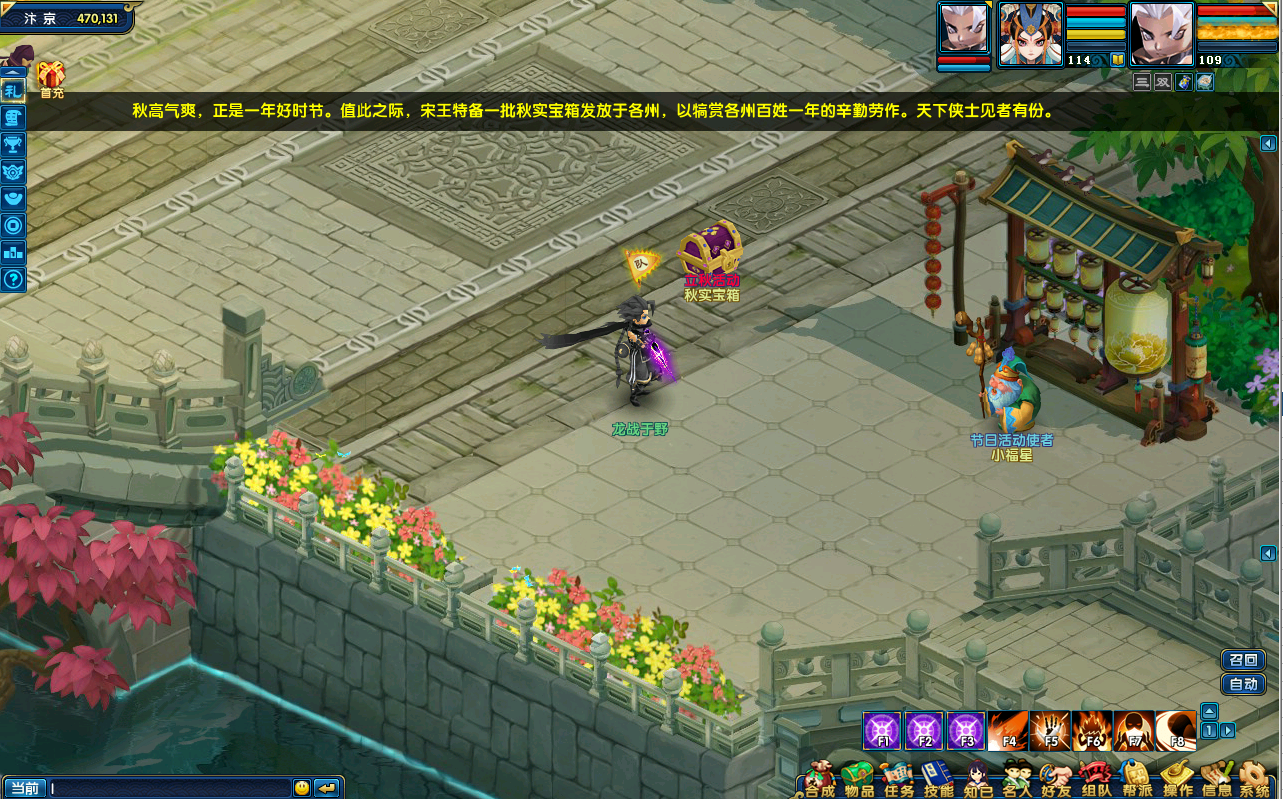 在4大城市及附加场景中随机刷出灯会宝箱,玩家寻找宝箱并获得相应奖励。奖励有金菊和各种通宝奖励,天下侠士见者有份。