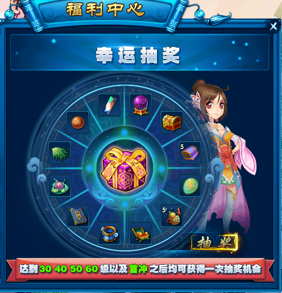 幸运抽奖:在达到30、40、50级以及首冲之后均可获得一次抽奖机会,当有抽奖机会时,点击界面中的抽奖按钮可进行抽奖,获得其中一个奖品。