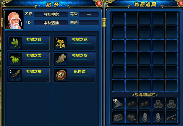 月桂神树乃月宫桂子掉落凡间长成,食用之可另功力大进并且长身不老,为此引来了江湖恶徒和野心家的争夺。为保世间太平,请大侠们速速打败江湖恶徒,把丢失的神树之物交给月桂神僧。每次上交道具种类越多,获得奖励越好。
